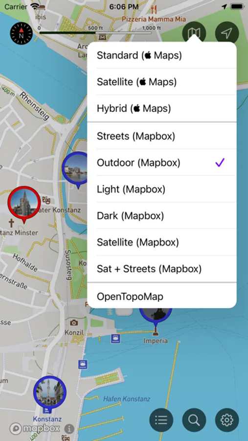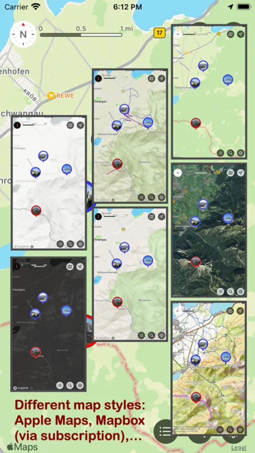 - Mapbox Maps via additional subscription (Streets, Outdoors, Light, Dark, Satellite, Satellite+Street). These high-quality maps are much more detailed (especially in nature, hiking trails, paths, outdoor activity etc.)