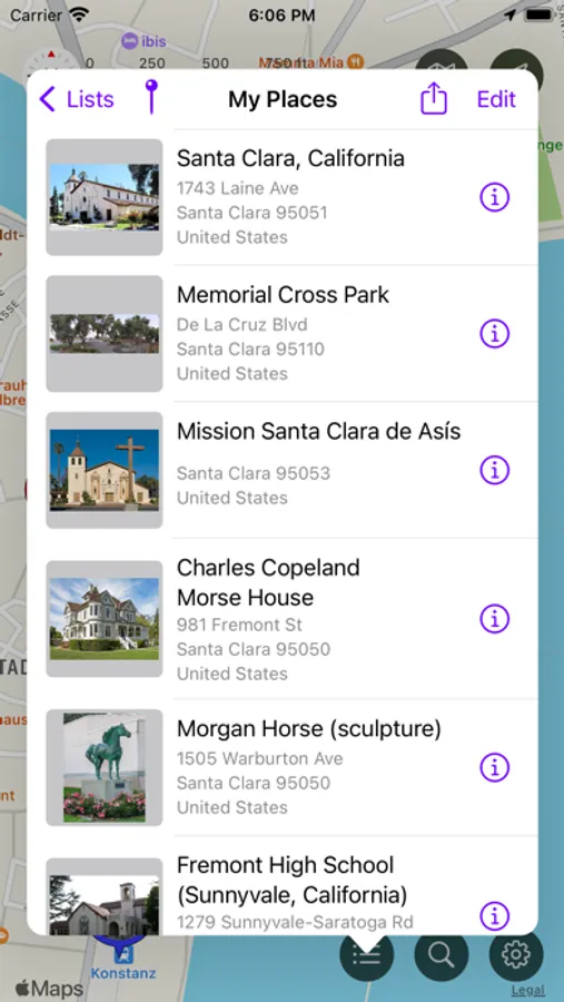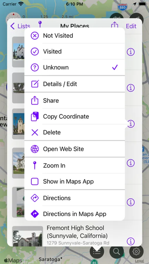- Show or hide lists and their places on the Map (so you can concentrate on those places you are currently interested in)