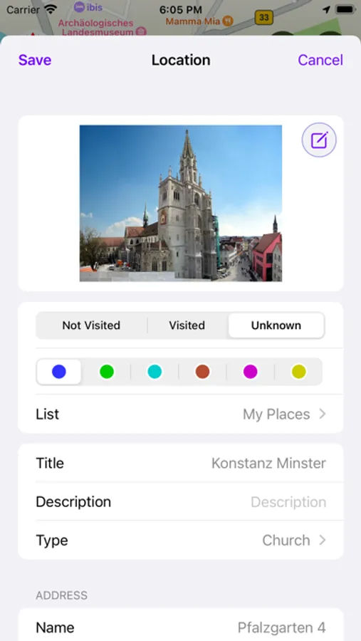 - Places can be shown/hidden on the map (based on lists, and visited status)