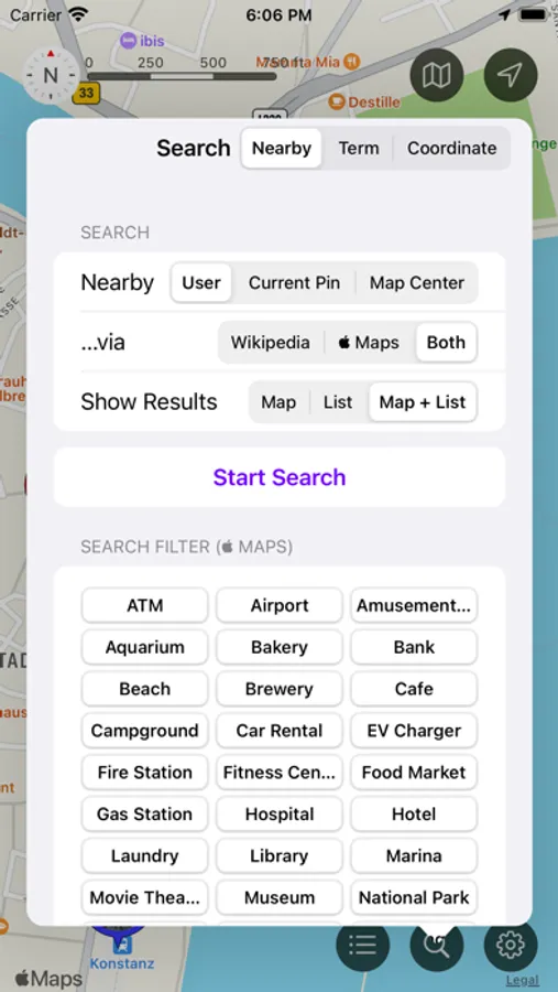 Note: The App supports even older iOS releases back to iOS 12. But the full feature set requires iOS 14 and newer. Only search features relying on Apple's map services can be limited under iOS 12 or 13, the search via Wikipedia will work under all iOS releases. e.g. filtering search results by POI category requires at least iOS 13. The search for POIs near a certain location requires iOS 14 and later.