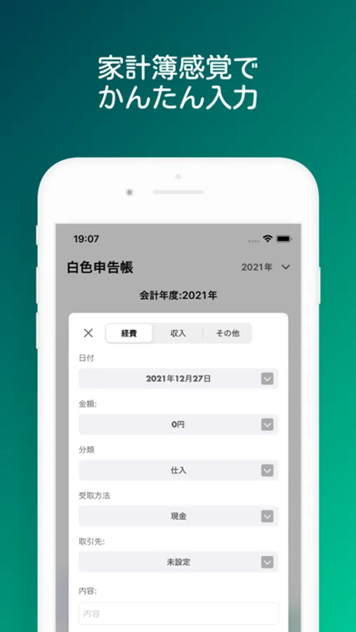 簿記が苦手な方でもわかりやすく、家計簿アプリのように日々の経費、収入を入力するだけで