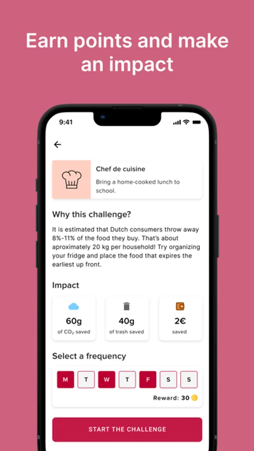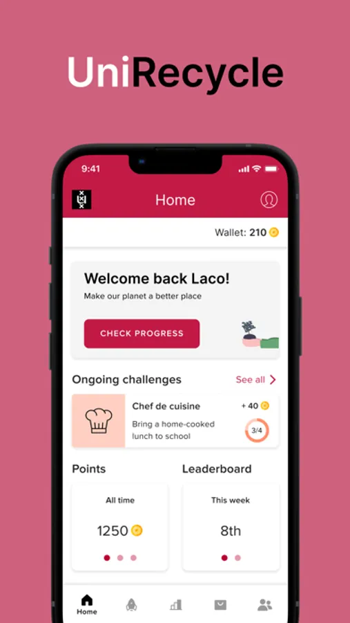 The app is designed to motivate UvA students to make sustainable choices about their waste production and overall environmental impact. It works by providing the user with challenges centered around sustainability - for example, packing lunches in reusable containers, rather than purchasing a packaged lunch. Once challenges are completed, users earn sustainability points that can be traded for rewards (discounts from our sustainable partners). Combined points also contribute to users’ place on the leaderboard, allowing users to compete with other students. The gamification-based system utilizes evidence-based intervention strategies for behavioral change, such as nudges, goal setting, and competition.