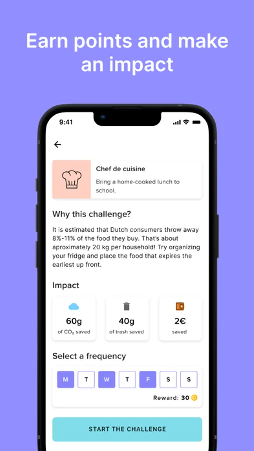The app is designed to motivate HvA students to make sustainable choices about their waste production and overall environmental impact. It works by providing the user with challenges centered around sustainability - for example, packing lunches in reusable containers, rather than purchasing a packaged lunch. Once challenges are completed, users earn sustainability points that can be traded for rewards (discounts from our sustainable partners). Combined points also contribute to users’ place on the leaderboard, allowing users to compete with other students. The gamification-based system utilizes evidence-based intervention strategies for behavioral change, such as nudges, goal setting, and competition.