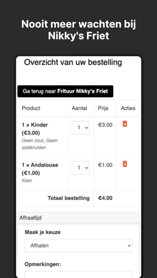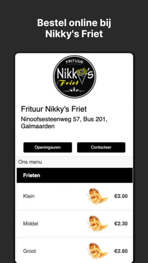 Nooit meer in de wachtrij staan bij Frituur Nikky's Friet. Plaats jouw bestelling via onze app en kom deze ophalen op het gekozen tijdstip.