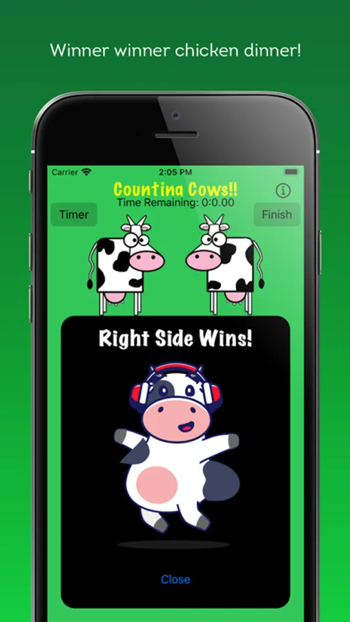 To win the game, you can play against a timer OR simply start playing the game and when you're ready to end the game, select Finish and watch a pretty little dancing cow appear to announce the winner.