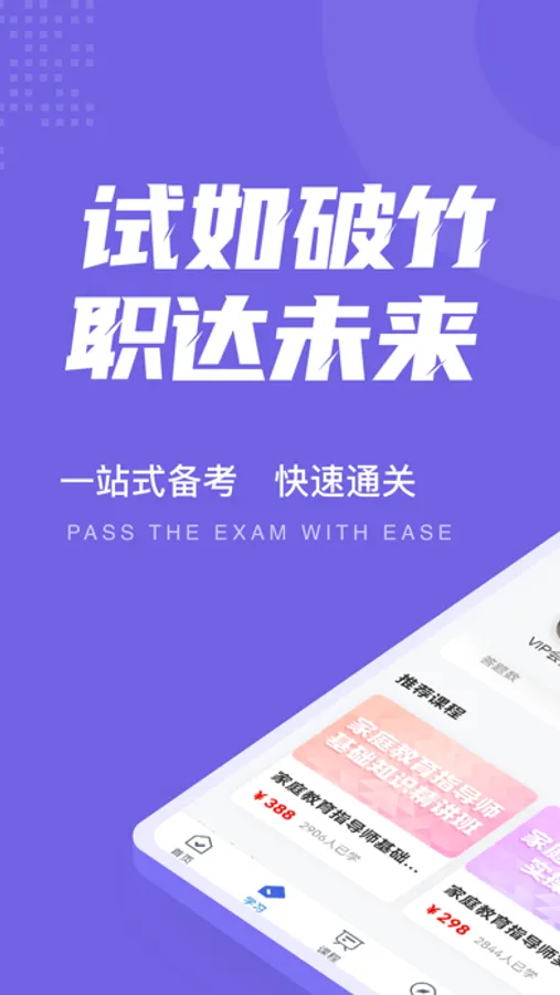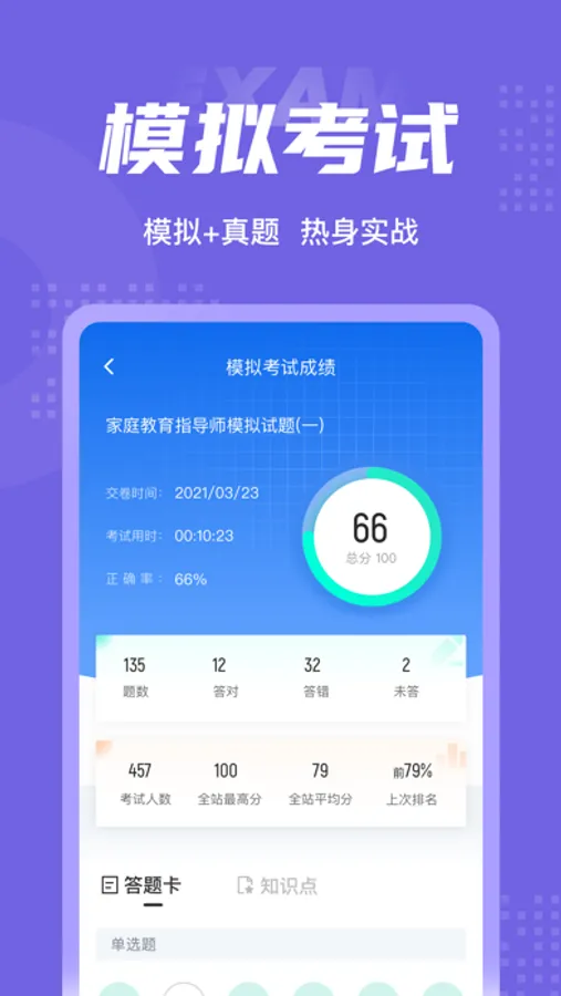 家庭教育指导师题库内含考点练习,全国通用卷以及地区卷模拟练习,以及按照固定考试比重的随机式的抽题的真题考场,成绩单实时记录考试数据,一点一滴的反馈考生近期学习状态以及自我正确率的提升,大大的给予考生通过考试的信心。