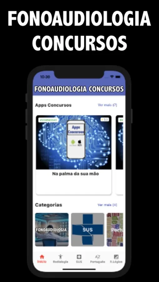 O App Fonoaudiologia Concursos tem questões de: Fonoaudiologia, SUS, Português e Raciocínio Lógico.