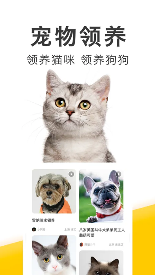 全品类宠物领养,包括猫舍纯种(有偿),流浪救助(无偿),主人送养(无偿), 线上沟通确认信息线下当面领养,为萌宠找到温馨的家。