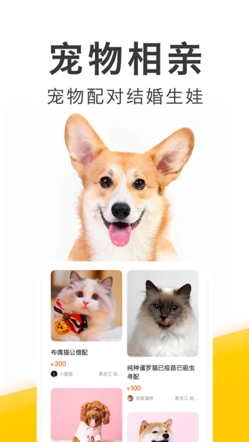 全品类宠物相亲,包括宠物寻配种,宠物借配种,可在线出价支持有偿相亲,赚取彩礼。
