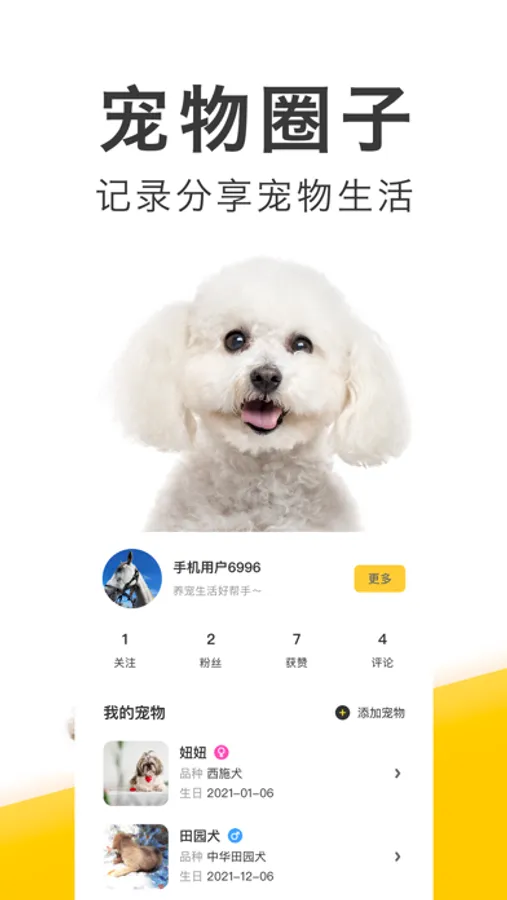 有只宠物社区平台,包括狗狗猫咪领养,狗狗猫咪相亲,狗狗猫咪寻配种借配种,狗狗猫咪成长记录,宠物喂养咨询问答,宠物在线交易,宠友交流社区,分享记录宠物日常生活。
