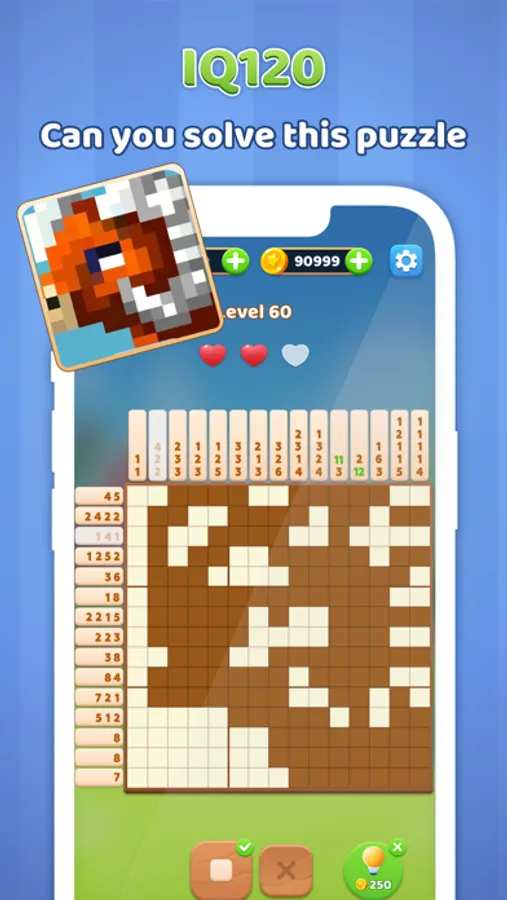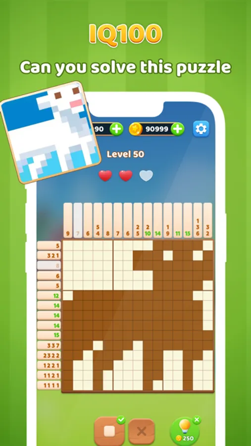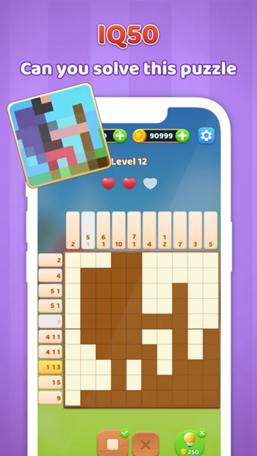 Solve logic number puzzles to get fabulous pixel arts and win diamonds to build your farm!
