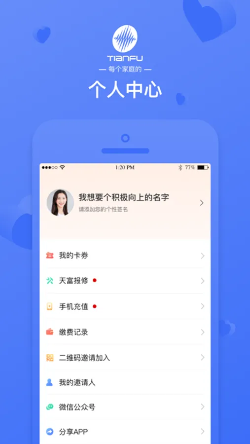 新疆天富一生约是一款集智慧健康、智慧家居、智慧物业、智慧社区、小区政务服务、共享经济、智慧商业、智慧旅游、智慧金融、党群服务等众多智慧生活服务功能于ー体的综合性智慧城市服务平台,让您足不出户即可享受现代生活带来的健康、便捷的品质生活。