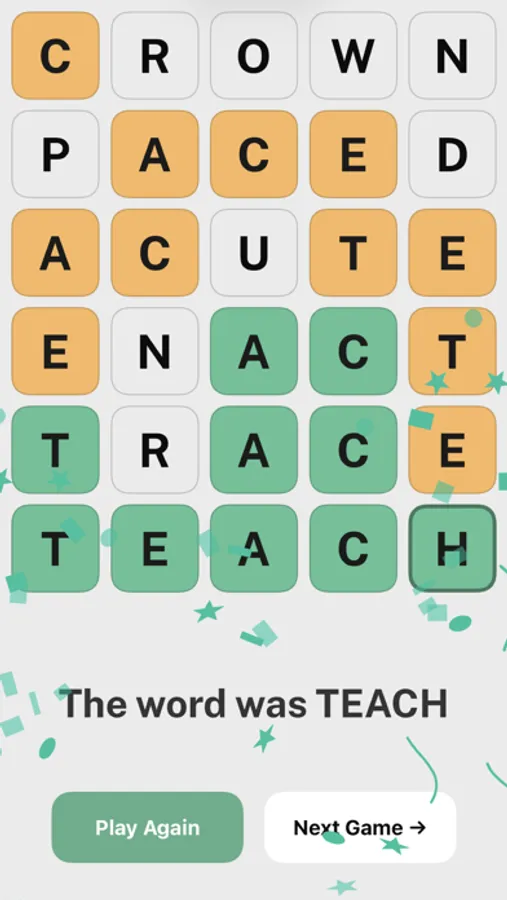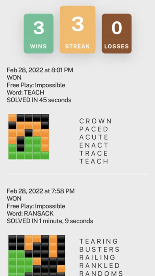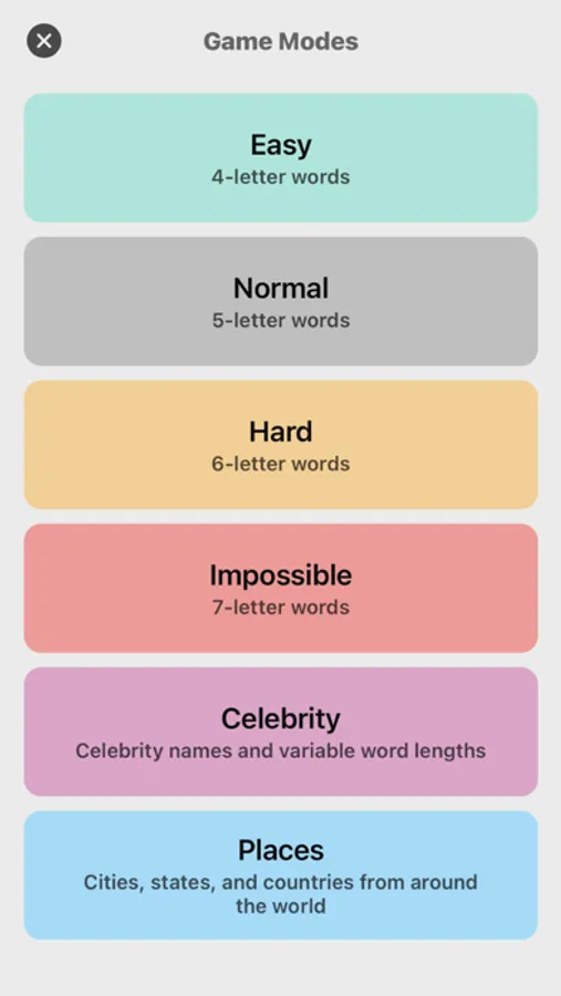 1. Guess the word in 6 chances or less. Each time you guess a word, you will find out which letters are correct. Use this information to solve the puzzle. See how many chances it takes to get the answer and how many in a row you can get right. Try tons of different game modes including Impossible Mode (7 letter words) and Celebrity Mode (guess the names of celebrities).