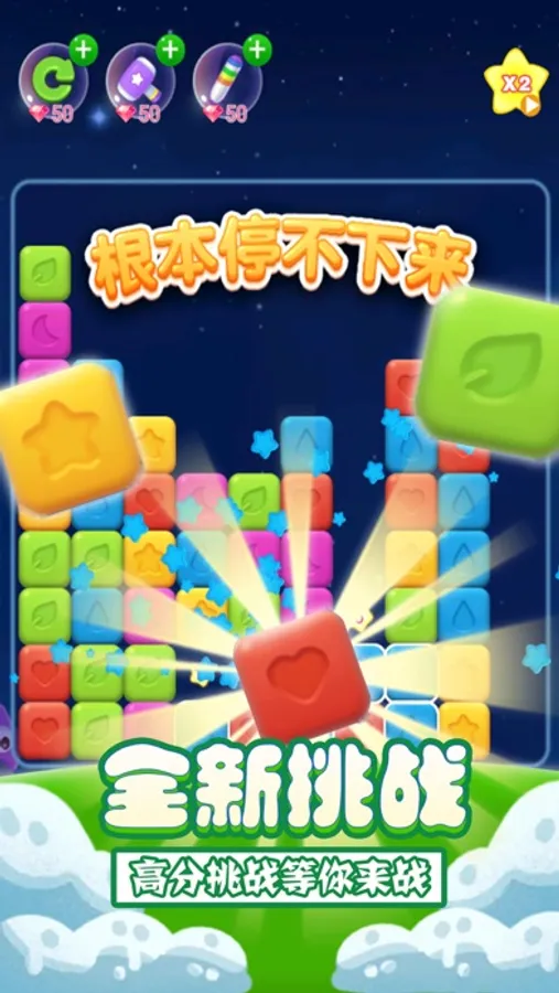 与怀旧之作“俄罗斯方块”相结合的拼接消除玩法,通过拖动方块到棋牌中摆满一行或一列后可消除方块,带玩家找回童年的乐趣