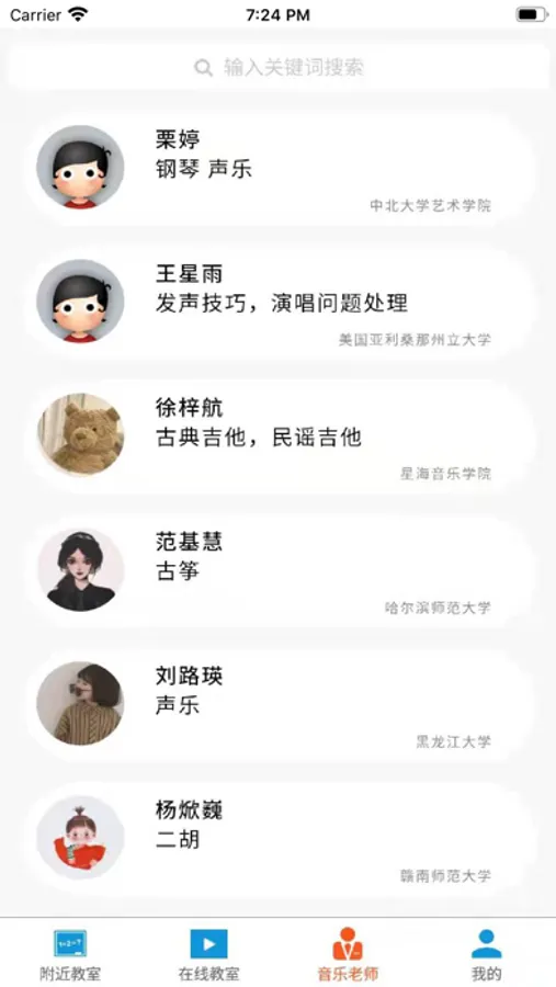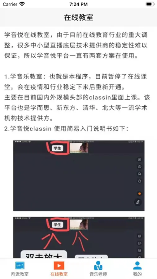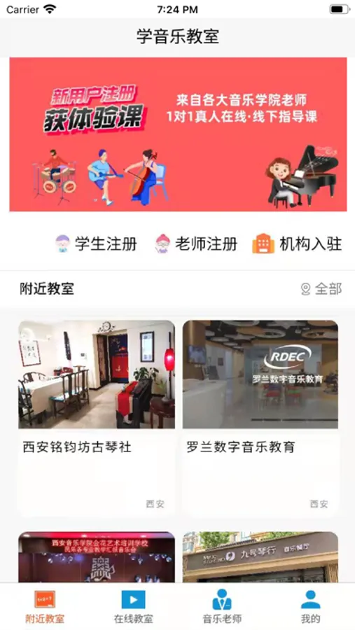 学音乐教室APP是一款在身边找到音乐教室和学音悦网专属教室使用平台,下载注册后即可获得一次在身边线下或线上音乐教室学习体验机会。平台拥有上万名来自上百音乐学院的专业老师,可以帮助音乐学习者进行1对1和小组小班课程教学,也可以为学生提供真人陪练服务。目前涵盖了学唱歌、学声乐、学小提琴、学钢琴、学大提琴、学古筝、学吉他、学单簧管、学长笛、学架子鼓、学萨克斯等丰富的专业音乐教室服务。