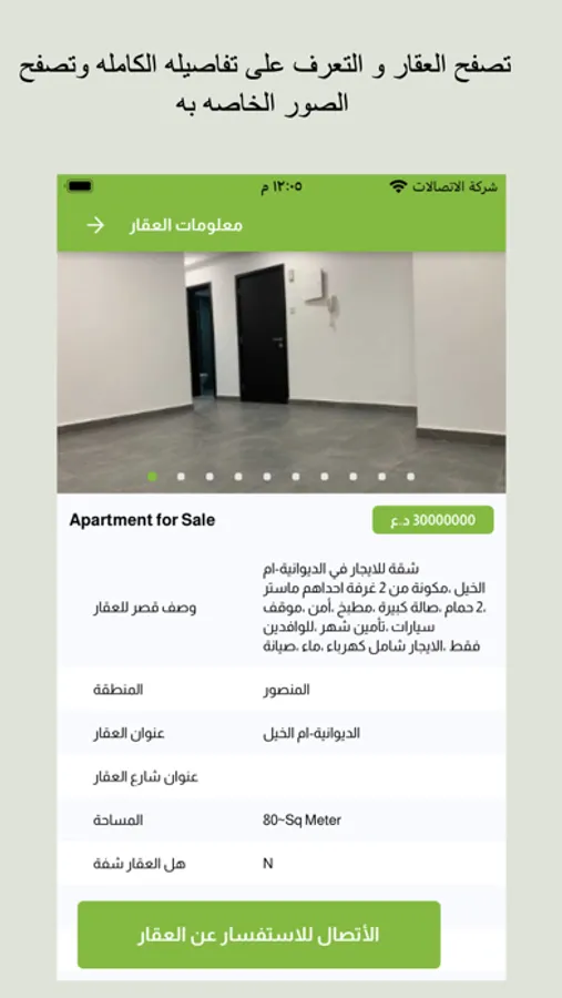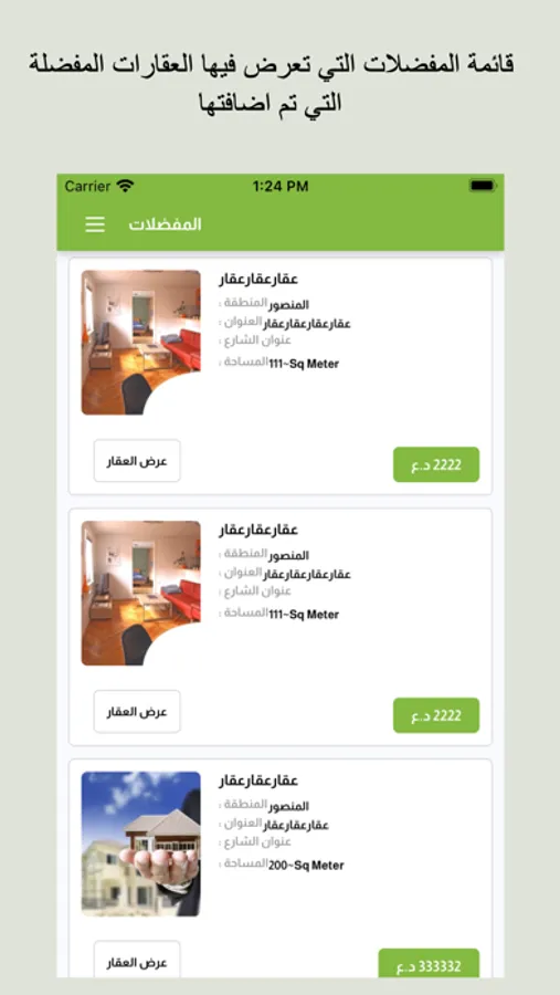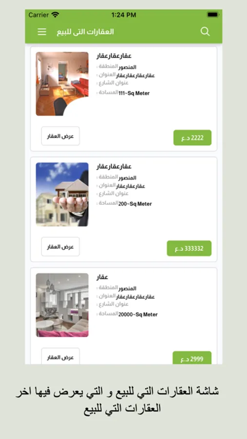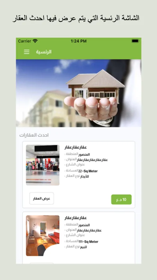 ميزة التطبيق انه يمكن للمستخدم من تصفح مجموعة من العقارات التي للبيع او الآيجار و ومعرفة تفاصيل كل عقار او اضافة العقار الى قاذمة المفضلات و التي يمكن العودة لها لاحقا