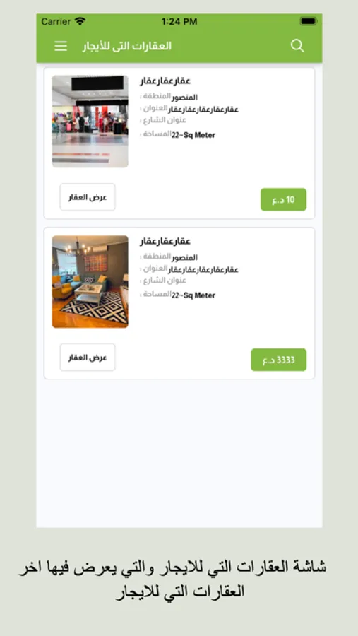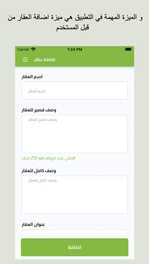 كما يوفر التطبيق ميزة وهي خاصية اضافة العقار حيث يمكن للمستخدم من اضافة عقار خاص بيه وعرضه للبيع او الآيجار.
