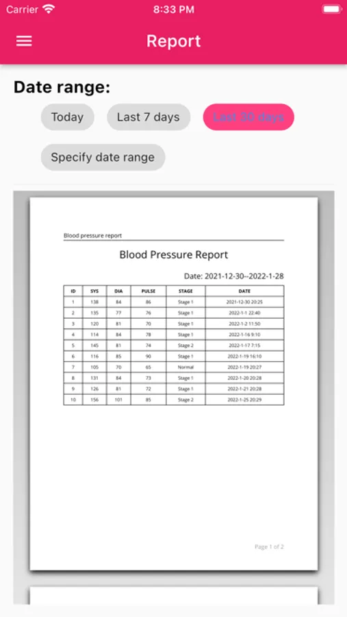 The blood pressure report generation module enables you to export blood pressure reports for easy viewing.
