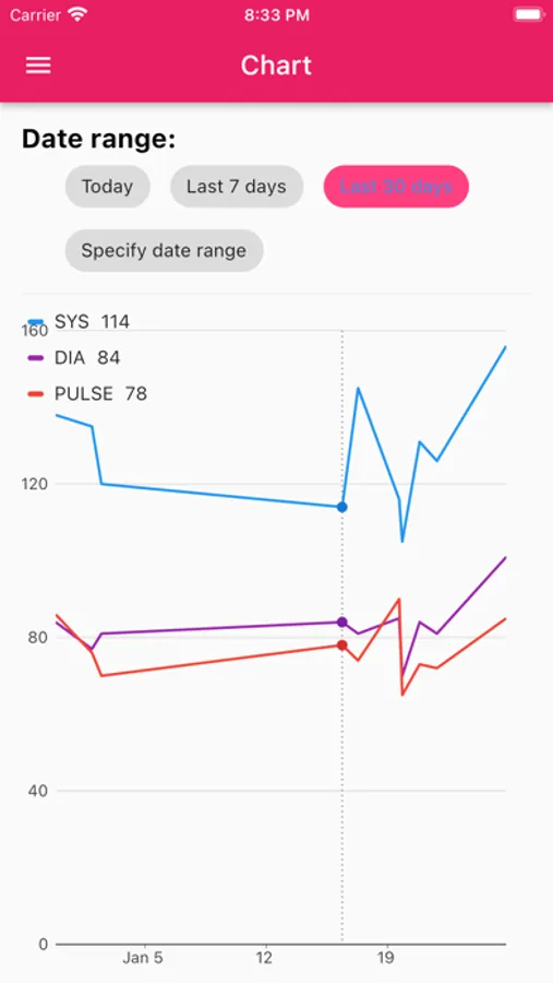 The chart analysis module uses vivid charts to show the trend of your blood pressure values.