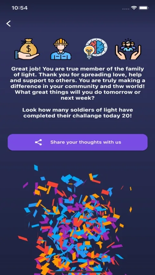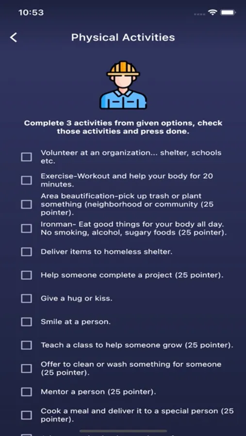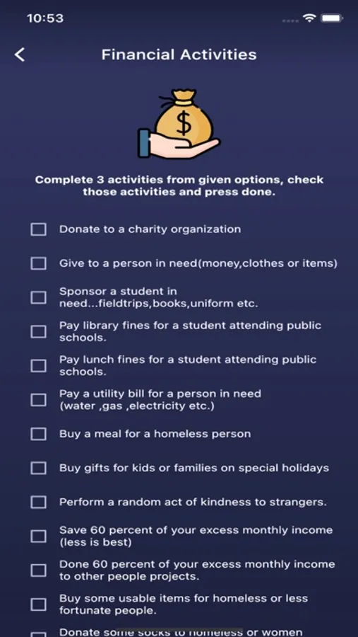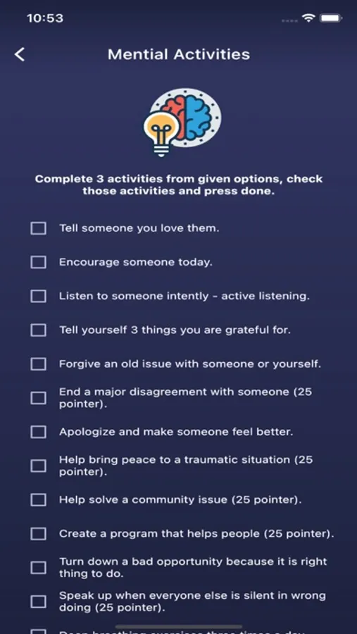The Ascend app reminds people to spread and perform acts of kindness in the world every day. The goal is to acquire 25 points in each of the four categories daily. The categories are physical, mental, spiritual, and financial. Completing activities in each of these categories will have a huge impact on your life and the world around you. Let's Ascend together.