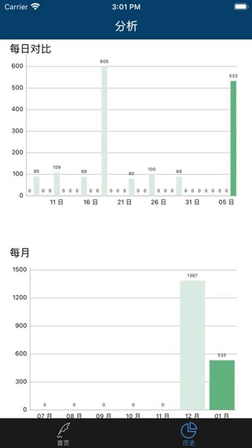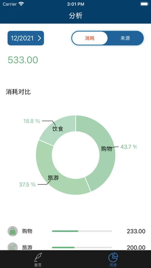 我们对您记录的账单提供输入支出分析工具,在历史账单中可以看到每月您的收入或支出中占比,也可以看到收入或支出中最高的模块,同样右上角的交易选择模块可以切换收入或支出,左上角的日期按钮可以切换历史月份,我们提供了近30天的数据柱状图,及近6个月数据的柱状图,如果您在使用项目中遇到任何问题,都可以通过邮件的方式给我们反馈 lenmontech@outlook.com
