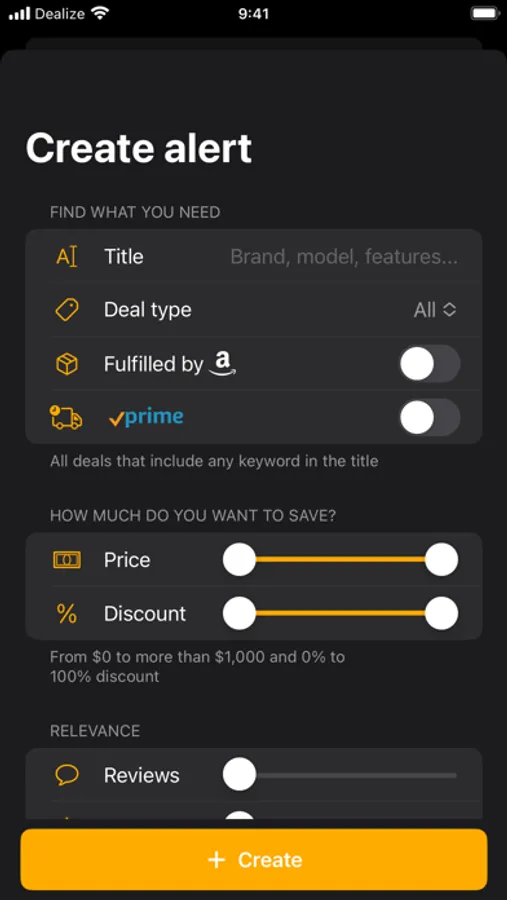 • Create new alerts by specifying the keywords to look for in the title, the deal & logistics type and Prime membership. You can also specify how much do you expect to pay with the price range, and how much do you want to save with the discount range. Additionally you can also specify the minimum amount of reviews and the desired minimum rating. Finally, specify the duration of the alert and the repetition behavior.