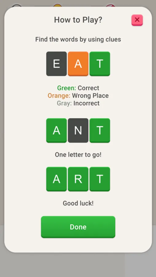- Orange means correct letter in the wrong place.