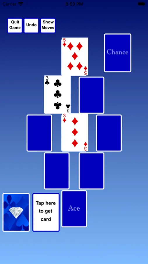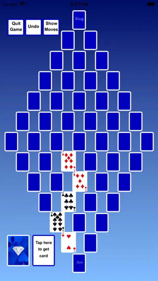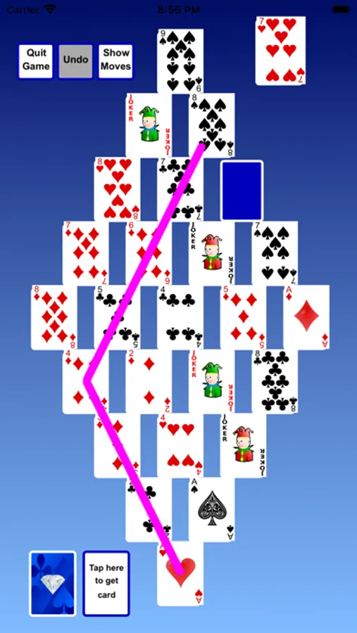 Draw cards from the deck to complete the diamond path from ace at the bottom to the high card at the top. Don't let the jokers block you.