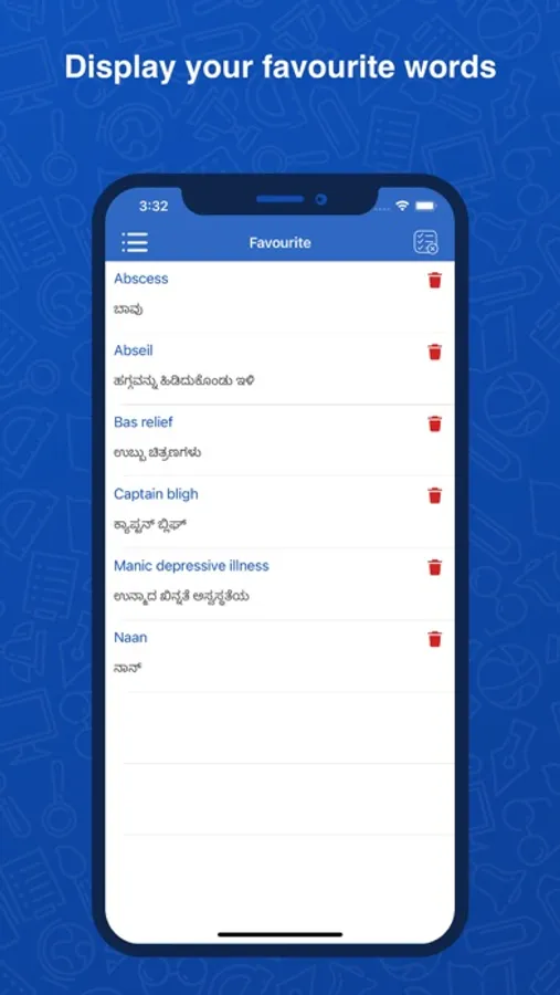7- You can create a favourite list in our app of the translated words and can share it with anyone in their English and Kannada meaning.