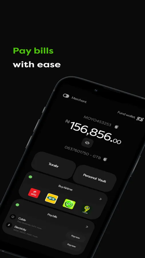 With the Merchant Services offering, you can open a business banking account with a click of a button, receive payments from clients and vendors, generate invoices and receipts, download a stamped bank statement in real time and transfer up to NGN5 million daily.