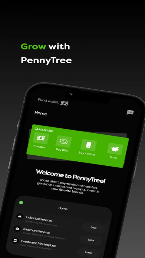 PennyTree is a neo-bank that provides you with financial services in the most convenient way. You now have access to individual services like bank transfers, bill payments, and personal vaults for savings, where you can earn up 15% per annum.
