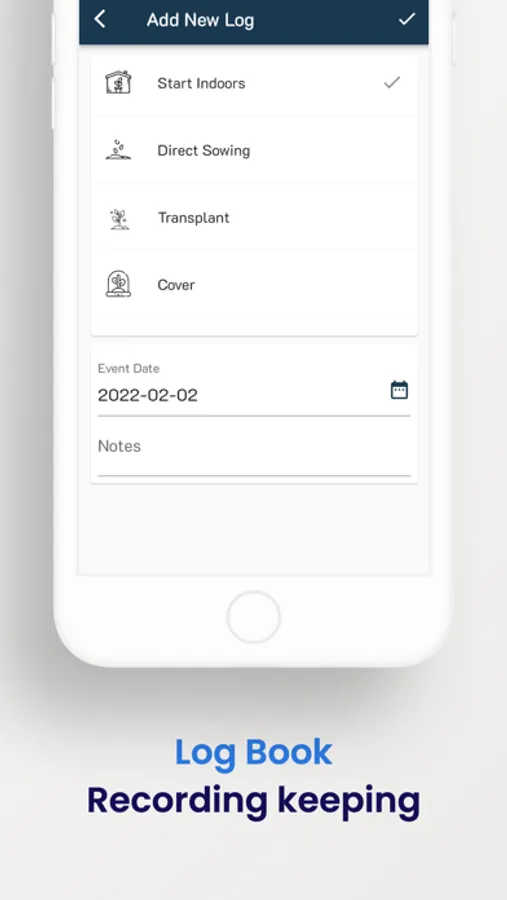 Once the crop is added click again on the crop and choose the log book from the bottom navigation bar. You can log following events for your crops