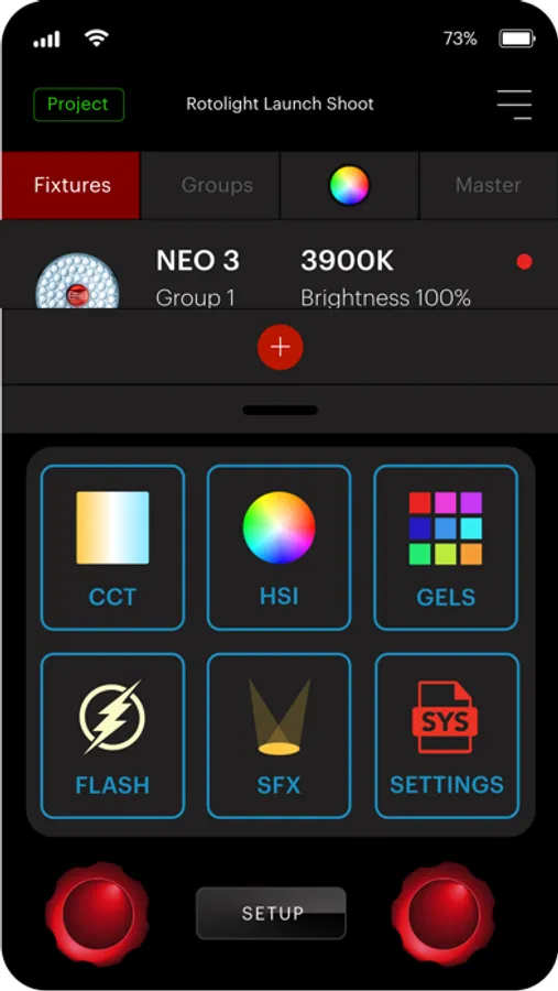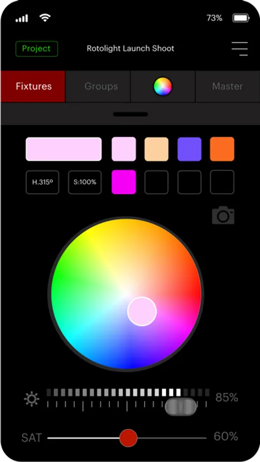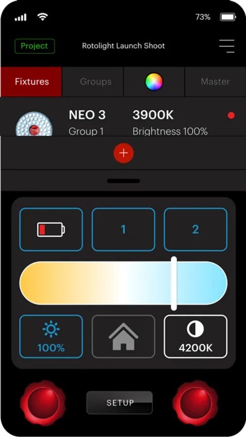 The Rotolight app features a virtual replica of the touchscreen on the back of your lights, with additional group and colour wheel control, so there is no need to get used to a new way of working.