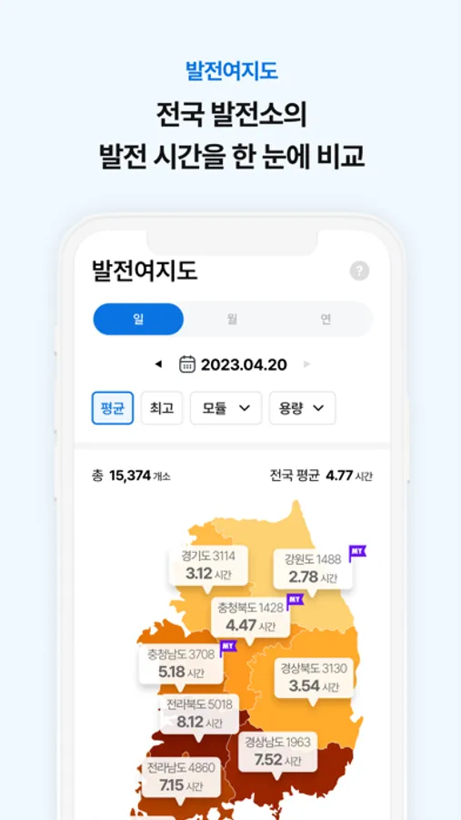 3. 발전여지도 - 지역별 평균/최고 발전 시간, 1등 발전소 정보 확인