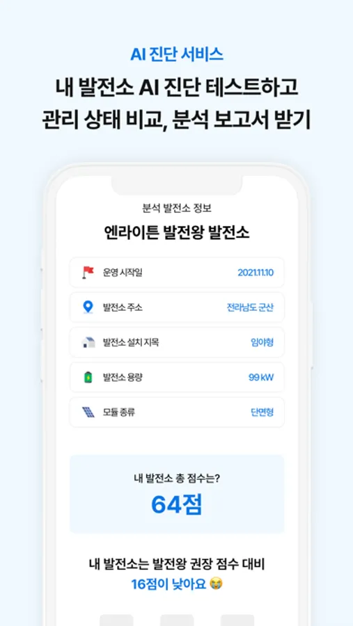 전국에 운영 중인 실제 발전소 데이터에 기반해 내 발전소를 비교, 분석하고 수익 증대 및 고정 지출 감소를 돕습니다.