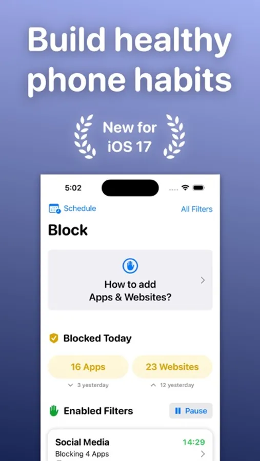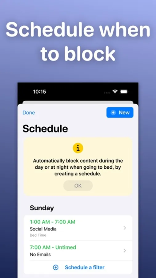 • Schedule filters to block social media distractions during the day, and at bed time