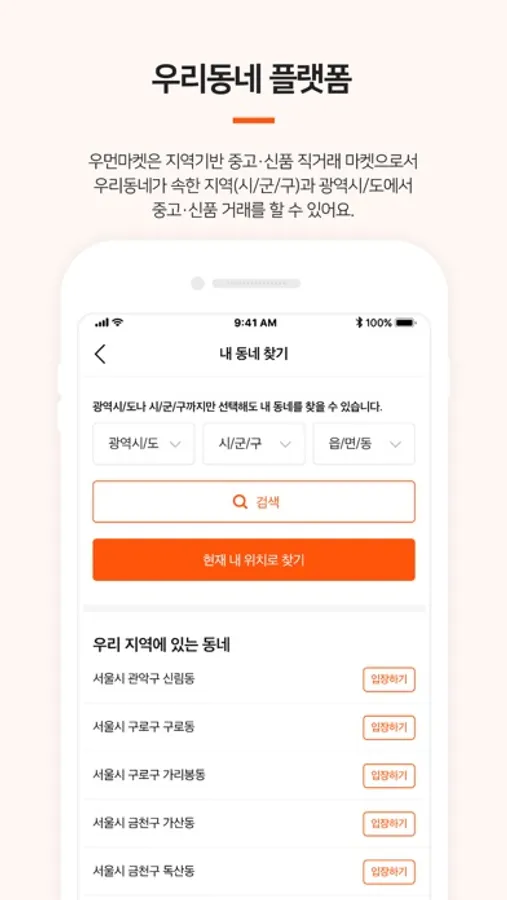 우리 동네가 속한 지역(시/군/구)과 광역시/도에서 중고·신품 거래를 할 수 있어요