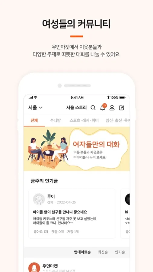 우먼마켓에서 이웃 분들과 다양한 주제로 따뜻한 대화를 나눌 수 있어요.