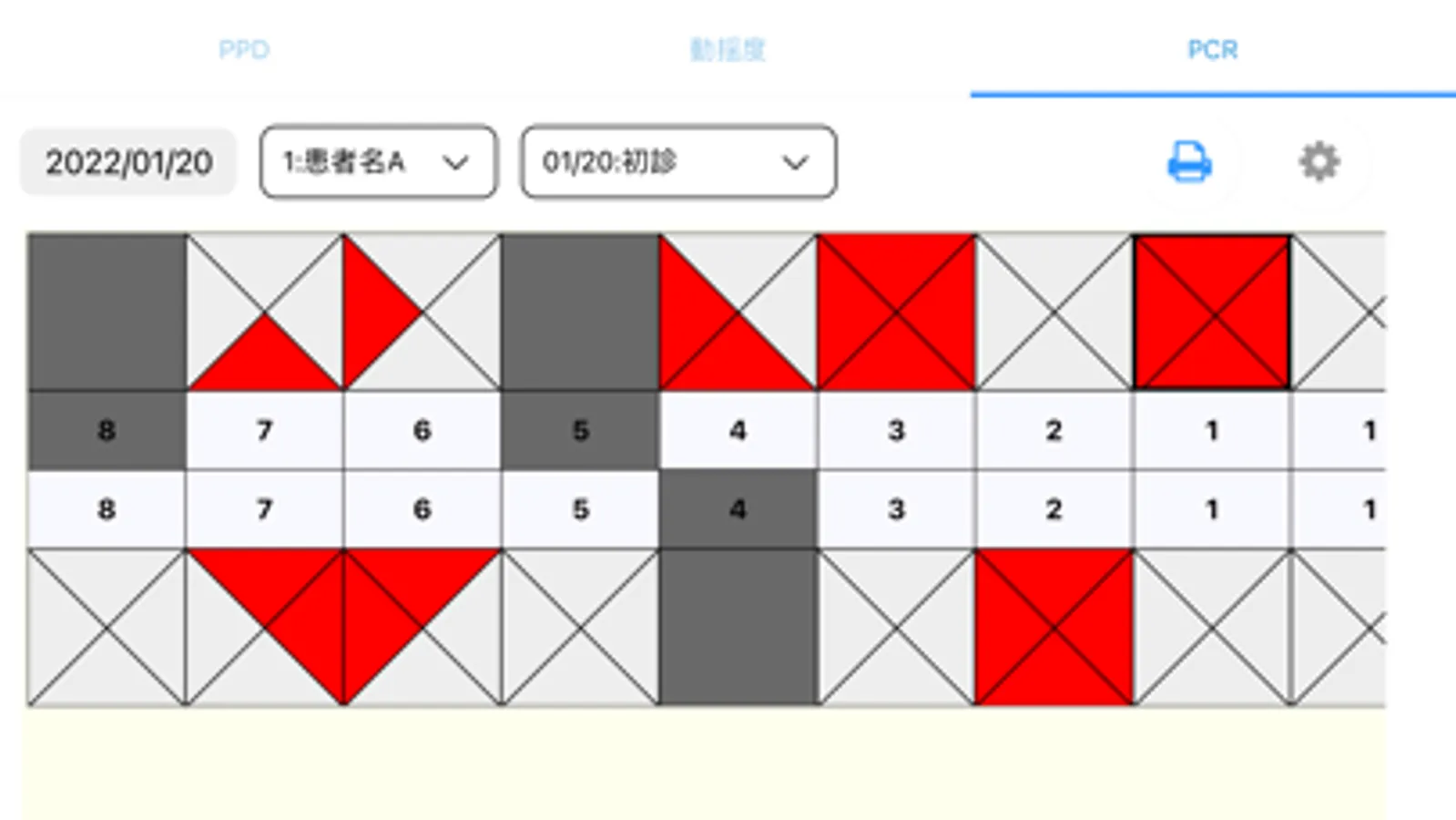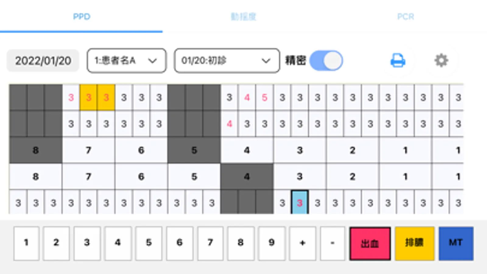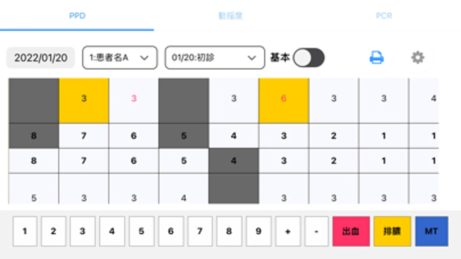 「PPD」、「動揺度」、「PCR」を患者や検査内容に応じて入力し、対象のデータを保存、印刷することができます。