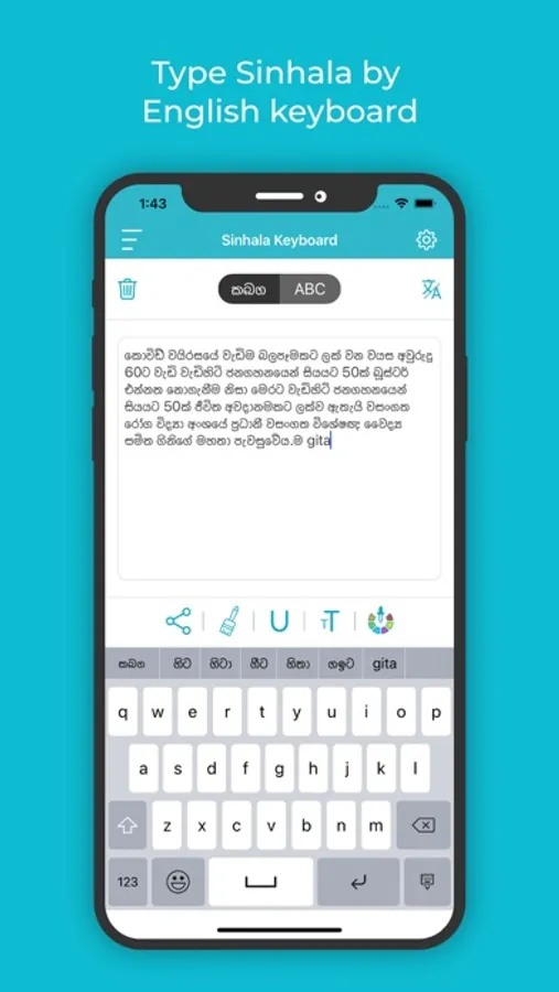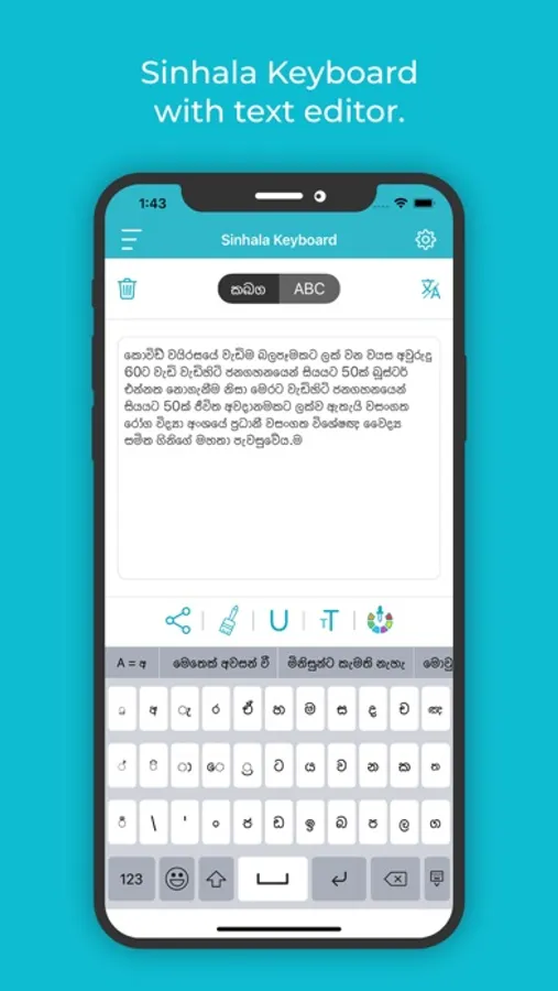 • Changing the font, the colour, underlining features inbuilt in this Sinhala keyboard iOS.