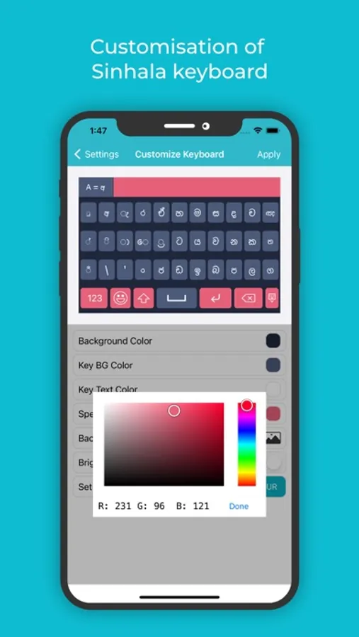 • Change colours for the Background colour, Key background colour, Keyboard text colour, Suggestion box colour etc, so that typing does not seem boring and monotonous with this Sinhala keyboard for iOS.