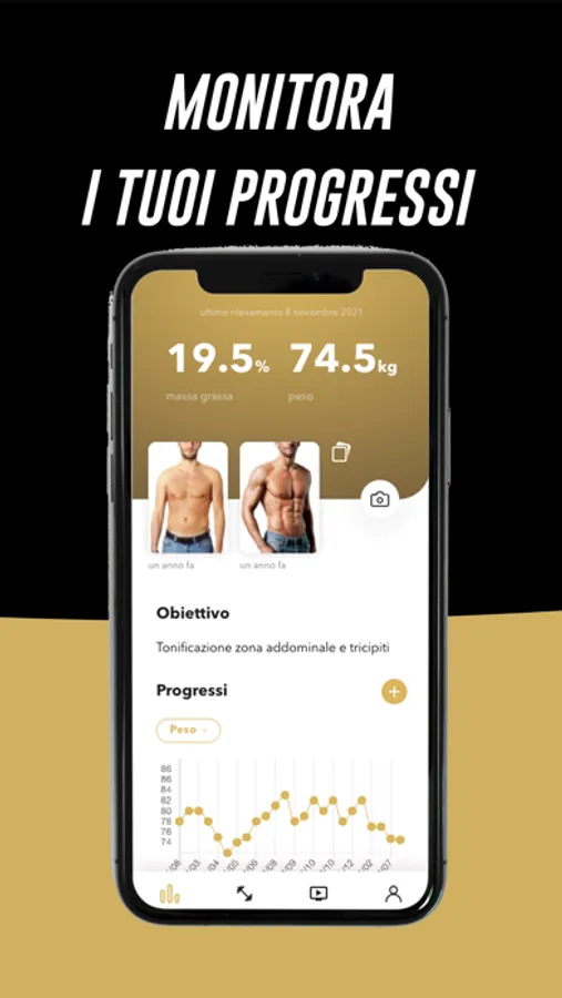 Avrai sempre sotto controllo la tua attività fisica: potrai visualizzare quali esercizi sono previsti nel tuo piano di allenamento, i tuoi progressi e come cambia il tuo fisico nel corso del tempo.