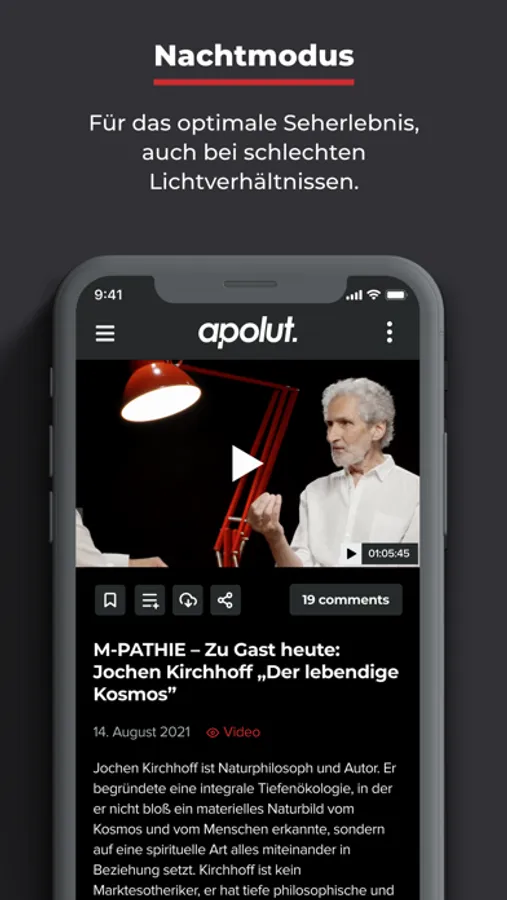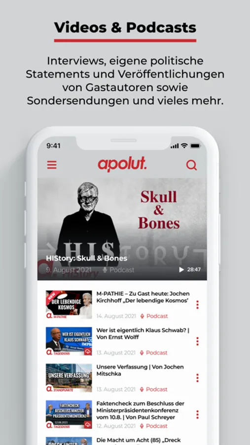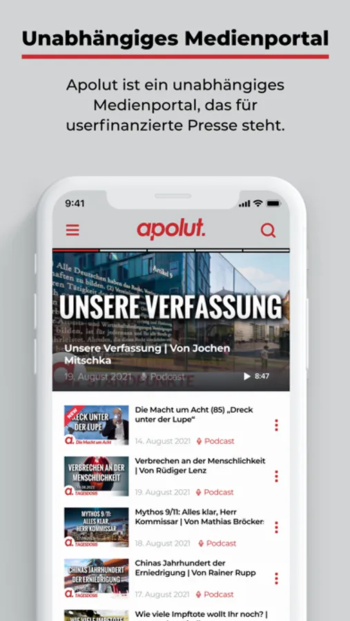 Democracy thrives on transparency and diversity of opinion. A complex society can only maintain internal and external peace if it succeeds in cultivating a positive culture of dispute and debate in the long term. Apolut is committed to this insight! We are an independent media platform that has set itself the task of offering more than just one perspective on a wide variety of topics. Apolut stands for free and 100% user-financed press. On apolut you will find various formats: Both exciting video interviews with people of contemporary history, as well as video series that want to close educational and information gaps. If you expect daily political reporting, Apolut is the right place for you. Our goals - diversity of opinion and freedom of the press - can only be achieved if KenFM's existing supporters help us transform to apolut and support apolut with a standing order. We believe in it!