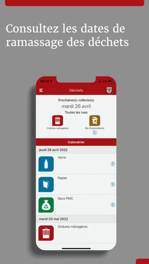 - Accédez aux dates des ramassages des déchets et recevez une notification pour vous rappeler de sortir les poubelles