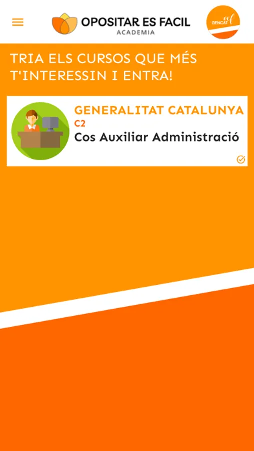 A OEF Gencat trobaràs materials didàctics útils, actualitzats i de qualitat que t'ajudaran en la teva preparació a les oposicions a la Generalitat de Catalunya (cos Subalterns Generalitat, cos Auxiliar administratiu Generalitat, Cos Administratius Generaltiat...). Concretament, posem al teu abast tests per posar-te a prova, simulacres d'examen, models d'examen dels darrers anys, i consells d'estudi personalitzats segons el teu rendiment a l'hora de fer els tests.