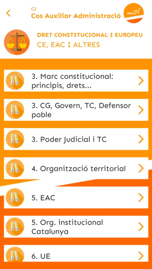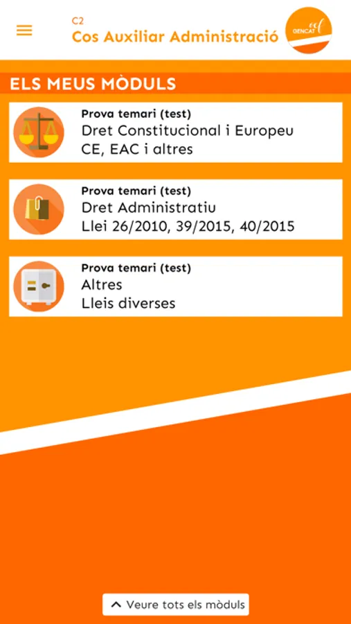 Veuràs que hem dividit l'aplicació en oposicions (Sublatern, Auxiliar administratiu, Administratiu) i, cadascuna d’ella, en mòduls.