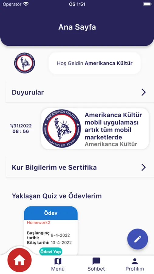 Amerikanca Kültür Mobil uygulaması öğrencilerimizin uzaktan da sınıf ortamındaymış gibi eksiklik hissetmemeleri için oluşturulmuştur. Uygulamamız içerisinde dil kurslarımıza kayıt olan öğrencilerimiz kurs hizmetlerimizden kolaylıkla yararlanabileceklerdir. Bunlar;