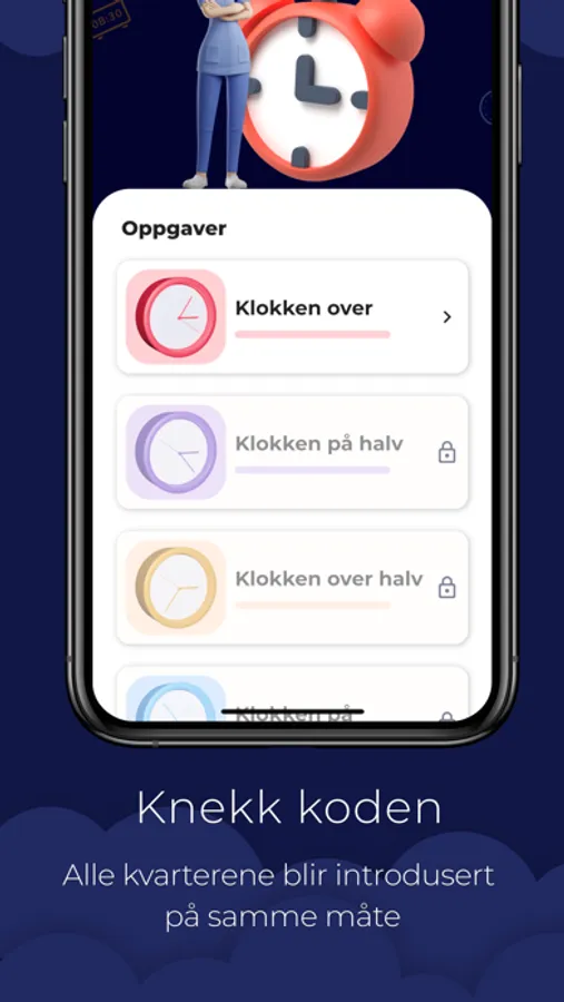 Hver del er utformet for å hjelpe barna å lære og øve på alle kvarterene. Stemmen i appen leser opp klokkeslett og veileder barna gjennom hele prosessen. Klokkeappen er fri for reklame og kjøp-i-app, og krever ikke registrering. Vi ønsker å gi en trygg og sikker læringsopplevelse.