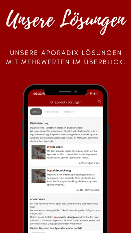 aporadix ist Ihr kompetenter Digitalarchitekt für Ihre Apotheke vor Ort. Wir nutzen die Digitalisierung als Motor für Ihre Apotheke. Mit unserem ganzheitlichen digitalen Entwicklungsansatz begleiten wir Sie vertrauensvoll zum Mehrwert. Ihr Apothekenkunde steht dabei im Fokus und Mittelpunkt. Das digitale Zeitalter bietet Apotheken neue Möglichkeiten, sich zu vernetzen und Arbeitsabläufe zu vereinfachen. Digitalisierung bringt eine deutliche Effizienzsteigerung und damit eine Verbesserung der Wirtschaftlichkeit. Mit dem aporadix Digital-Check analysieren wir Ihre Apotheke im 360° rund um Blick. Ihr Mehrwert: Sie erhalten als Wegweiser Ihren Performance-Bericht mit konkreten Handlungsempfehlungen für Ihre Apotheke. Mit den aporadix Digital-Entwicklungspaketen machen Sie Ihre Apotheke fit für die digitale Zukunft. Ihr Mehrwert: Sie sichern sich eine maximale Umsetzung Ihrer individuellen Apotheken-Digital-Strategie.