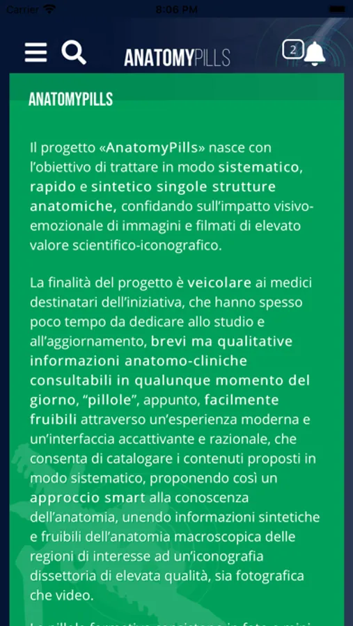 Il progetto «AnatomyPills» nasce con l’obiettivo di trattare in modo sistematico, rapido e sintetico singole strutture anatomiche, confidando sull’impatto visivo-emozionale di immagini e filmati di elevato valore scientifico-iconografico, e offre allo specialista uno strumento di rapida consultazione, utile ad approfondire aspetti specifici legati allo studio dell’anatomia umana.